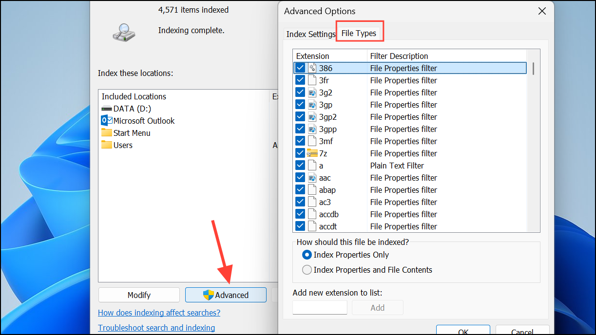 Step 1: In Indexing Options from Control Panel, click Advanced, then go to the File Types tab.