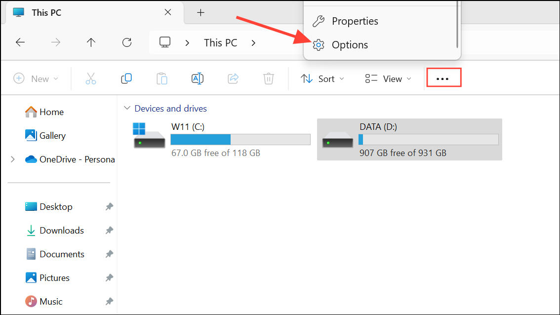 Step 1: Open File Explorer, then click the three-dot menu and select Options.