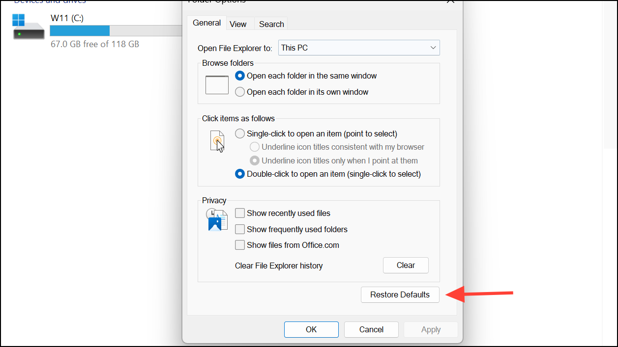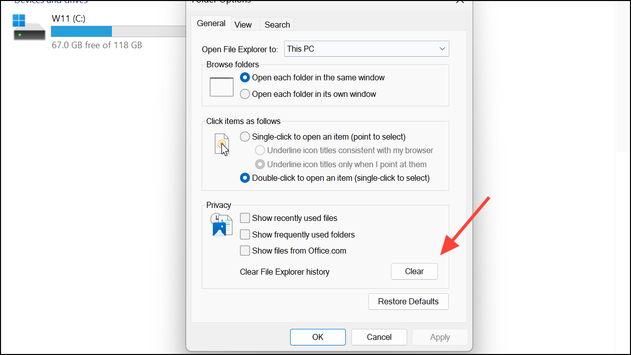 Step 2: Under the "Privacy" section, click Clear to remove File Explorer history.