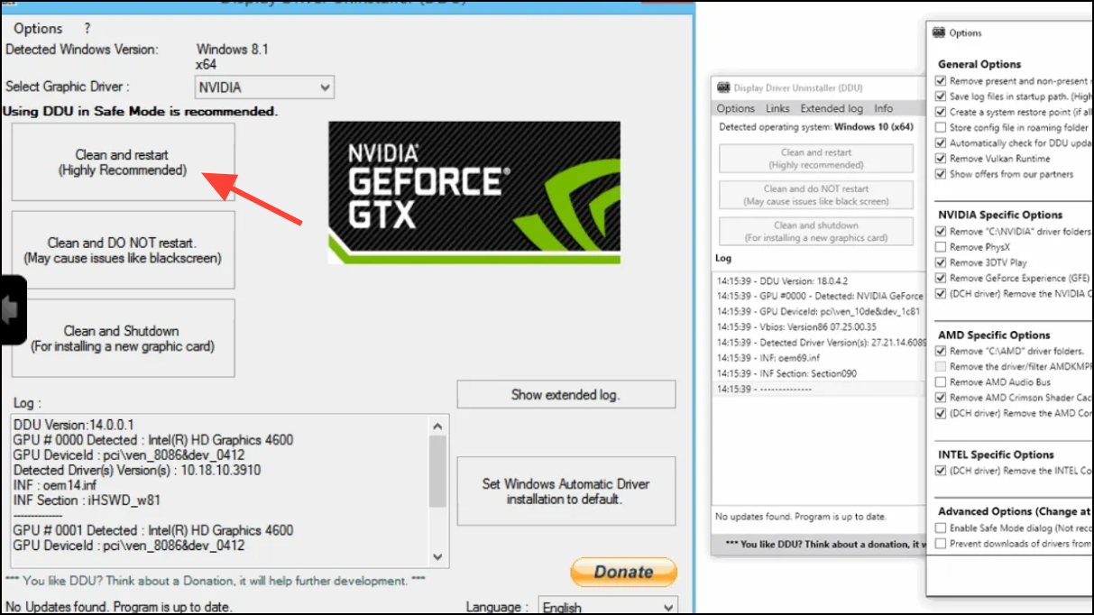 Step 2: Before installing, use Display Driver Uninstaller (DDU) in Windows Safe Mode to remove existing Nvidia drivers. This step prevents conflicts and ensures a clean installation. Open DDU, select Clean and restart.