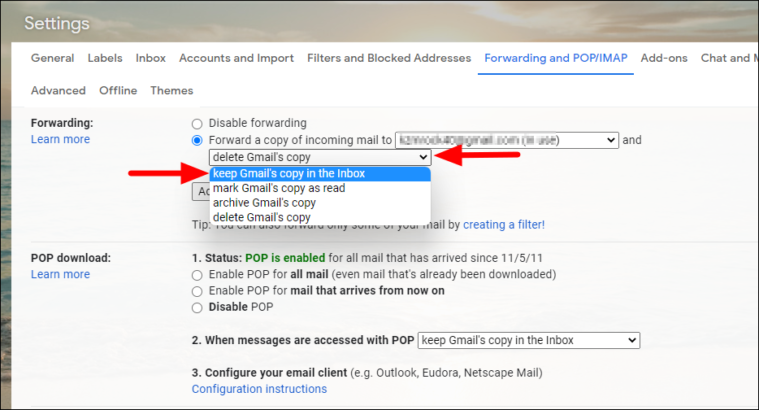 To change the forwarding settings and keep the email in the inbox, click on the second drop-down menu and select the ‘keep Gmail’s copy in the inbox’ option.