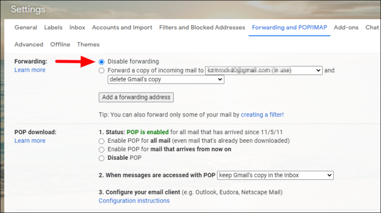 To check email forwarding settings, go to Gmail ‘Settings’ as discussed earlier and navigate to the ‘Forwarding and POP/IMAP’ tab at the top. Next, check if the ‘Forwarding’ is enabled and the current settings.