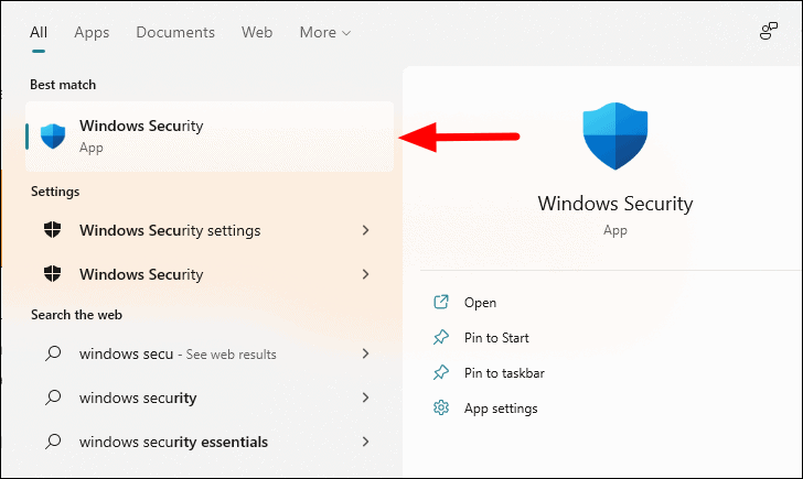 To disable the firewall, search for ‘Windows Security’ in the ‘Start Menu’ and click on the relevant search result to launch the app.