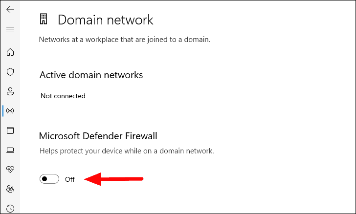 Now, click on the toggle under ‘Microsoft Defender Firewall’ to disable it.