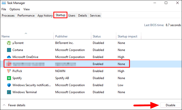 To disable an antivirus from running at startup, press CTRL + ALT + DEL, and select the ‘Task Manager’ option. Next, navigate to the ‘Startup’ tab from the top, select the antivirus and click on ‘Disable’ at the bottom.