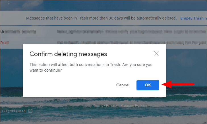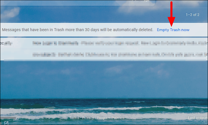 After you delete the emails in ‘Inbox’, they are moved to ‘Trash’ folder. To clear up space, you will have to permanently delete them from the ‘Trash’ folder. Navigate to the ‘Trash’ folder from the left, and click on ‘Empty Trash now’ at the top.