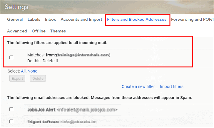 In the Gmail ‘Settings’, navigate to the ‘Filters and Blocked Addresses’ tab from the top and check if any filters have been created. As so you see below, a filter has been set to delete emails from a particular account.