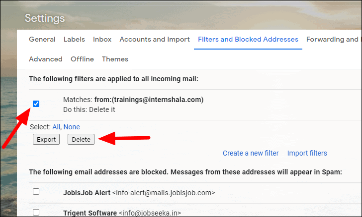 To delete a filter on Gmail, select the checkbox behind the filter and click on the ‘Delete’ option under it.