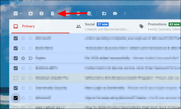 To delete the emails on Gmail, tick the checkbox before the emails that you want to delete and click on the ‘Delete’ icon.