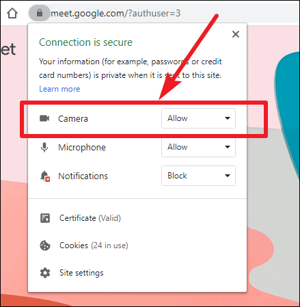 Sometimes the culprit can be something as simple as a neglected permission in your browser. Websites need explicit permission to be able to use your device camera and microphone. So, make sure that Google Meet has permission to access your camera.