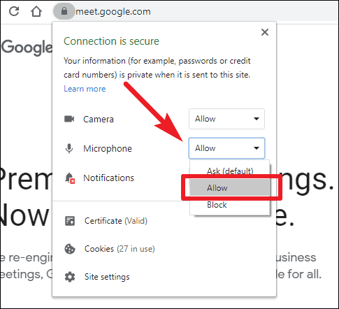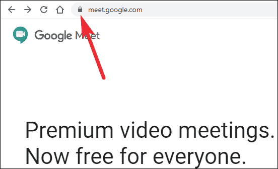 Go to meet.google.com and click on the ‘Padlock’ icon on the left side of the Address Bar.