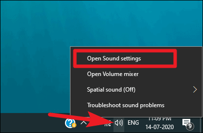 Go to the ‘Sound’ icon on the Windows taskbar and right-click on it. Then, select ‘Sound settings’ from the context menu.