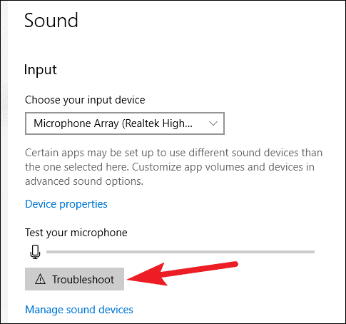 If nothing else worked, there’s one last thing you can try. Go to the Sound settings again, and in input devices, click on the ‘Troubleshoot’ button under ‘Test your Microphone’ to run the troubleshooter.