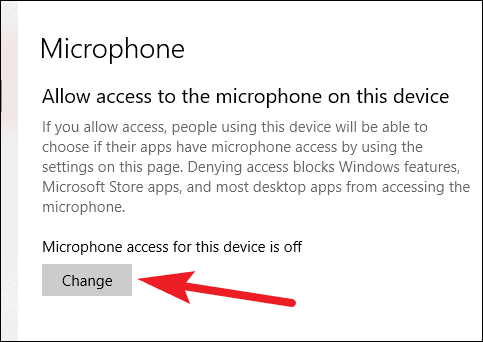 First, make sure that under ‘Allow access for the microphone on this device’, the message ‘Microphone access for this device is on’ is being displayed. If not, click on the ‘Change’ button.