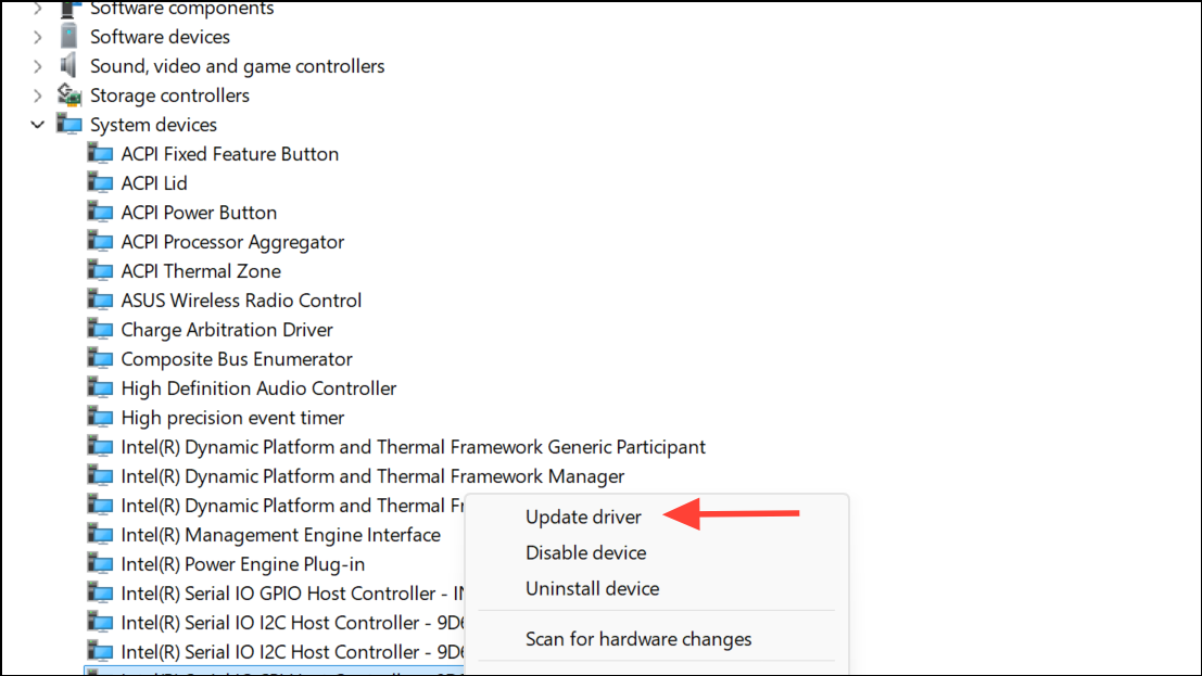 Step 1: Open Device Manager and expand the System Devices section. Right-click Intel(R) Smart Sound Technology (Intel(R) SST) Audio Controller and select Update Driver.