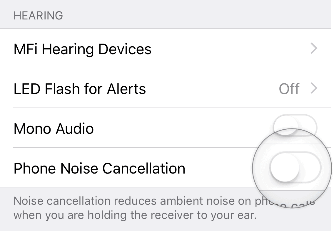 - Scroll down to near the bottom of the screen. You’ll see Phone Noise Cancellation option under Hearing section.