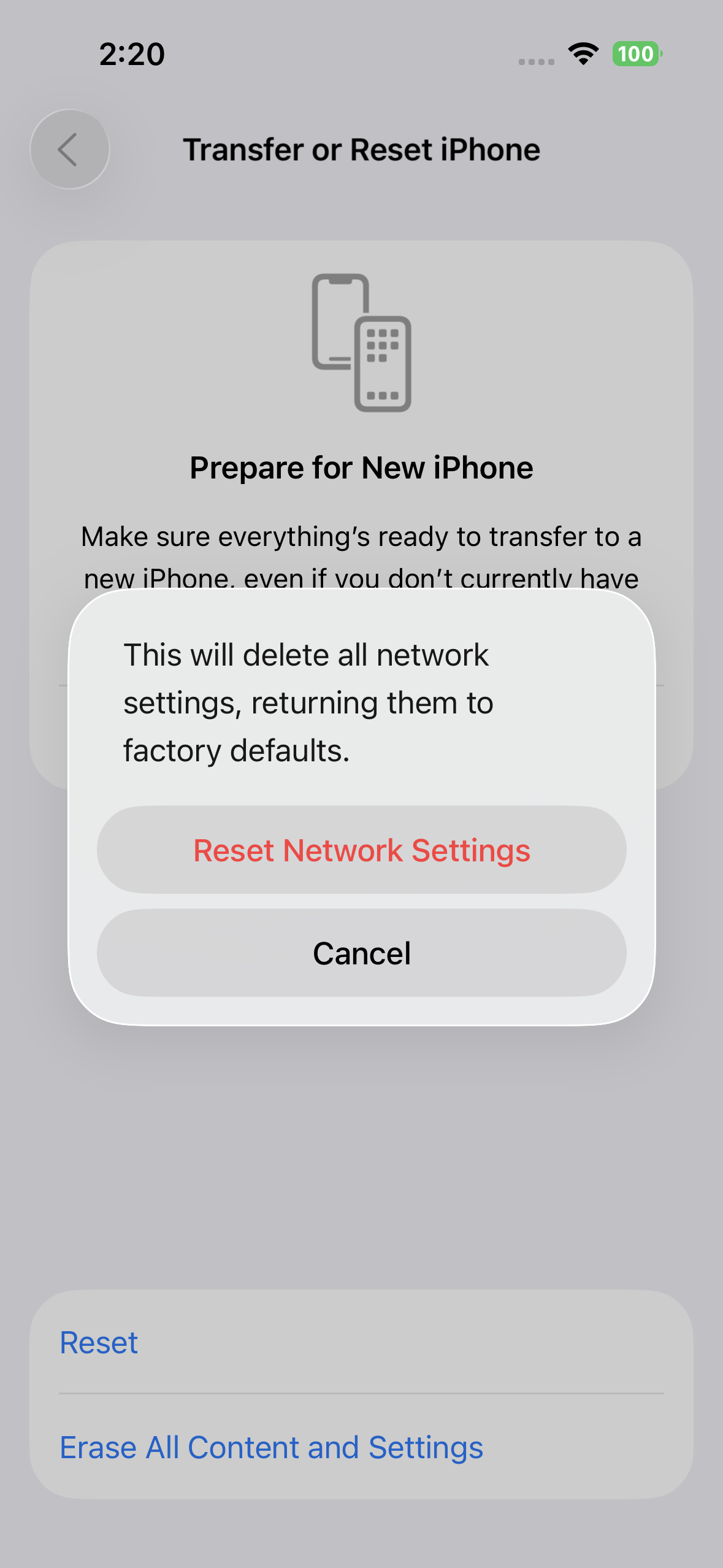 Step 1: Go to Settings > General > Transfer or Reset iPhone > Reset > Reset Network Settings. Confirm the reset to reload radio configuration files.