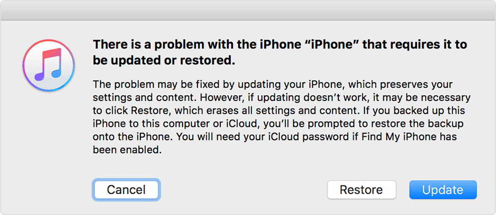 When you get a prompt from iTunes to Restore or Update your iPhone XS, select Update.