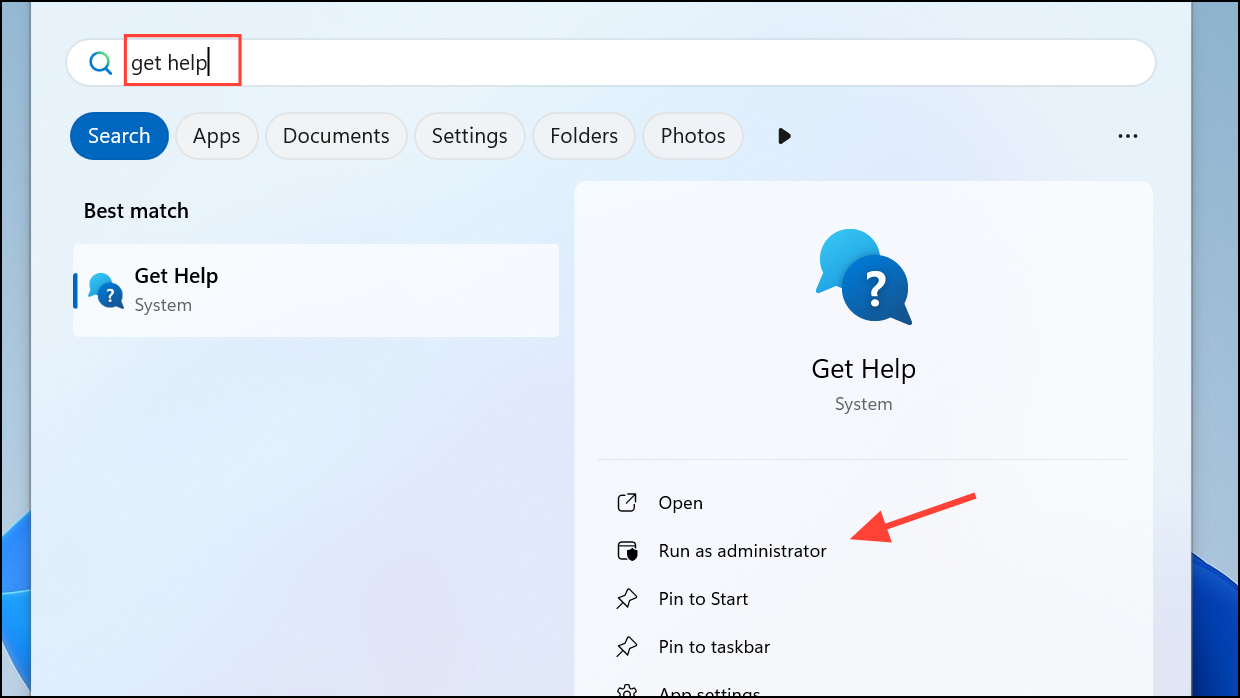 Step 1: Open the Get Help application by clicking the Start button, typing Get Help in the search bar, and selecting the app from the results. For best results, right-click the app and choose Run as administrator to ensure full system access for troubleshooting.
