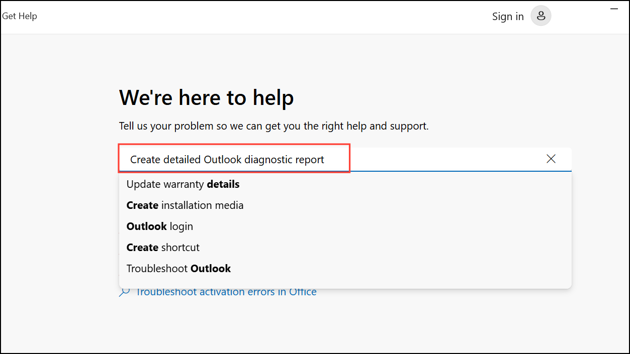 Step 1: In the Get Help app, search for Create detailed Outlook diagnostic report and select the prompt to begin the advanced scan.