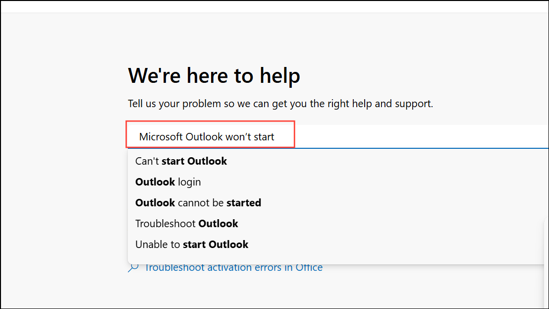 Step 1: Open Get Help and enter Microsoft Outlook won’t start in the search field. The app will identify and launch the Outlook Startup Troubleshooter.