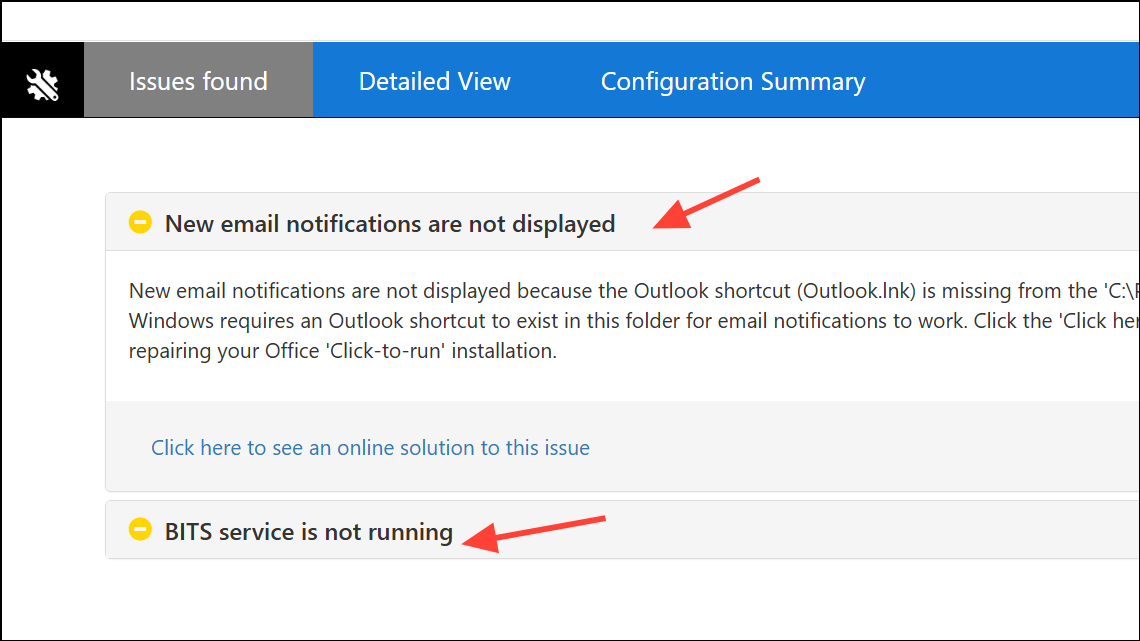 Step 4: Review the report for flagged problems, such as corrupted profiles, failed add-ins, or network connection failures. Use the guidance provided to address each issue. If needed, share the report with technical support or IT staff to accelerate the resolution process.