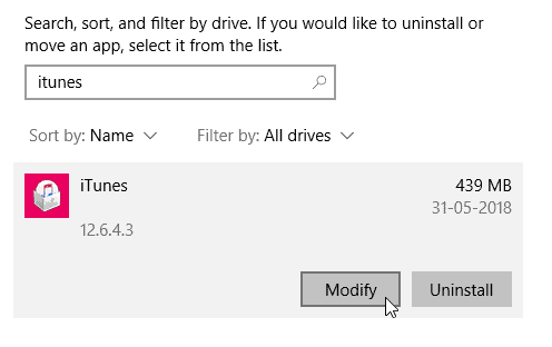- Click on iTunes, and then click Modify.