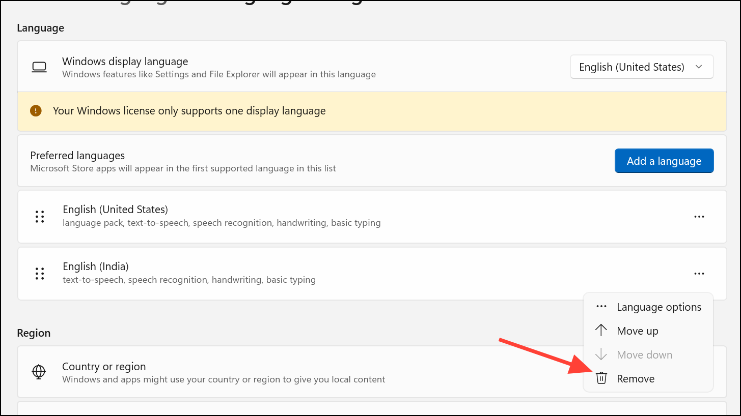 Step 2: Under Preferred languages, review the list of installed languages. Click the three-dot menu next to any language you do not use and select Remove to delete it from your system.