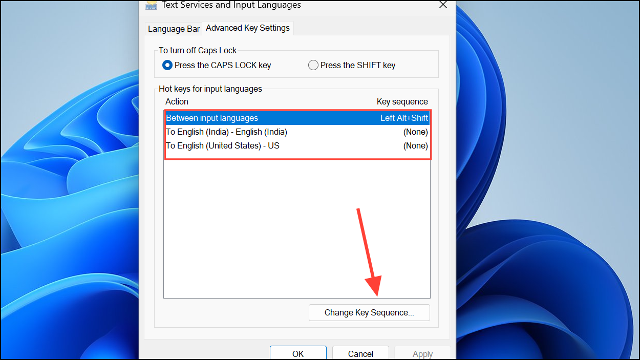 Step 3: Under Hot keys for input languages, select each entry and click Change Key Sequence.