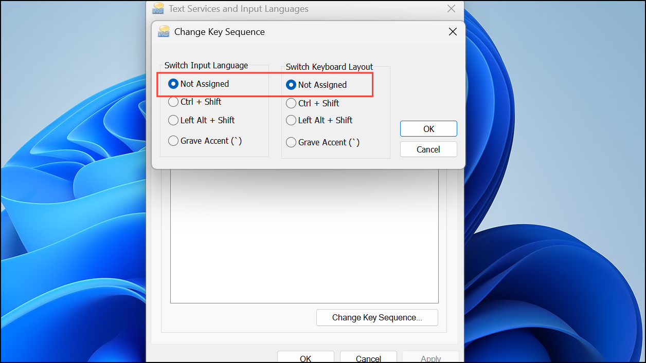 Step 4: In the dialog, select Not Assigned for both Switch Input Language and Switch Keyboard Layout, then click OK to confirm.