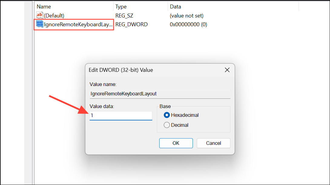 Step 3: Right-click in the right pane, select New > DWORD (32-bit) Value, and name it IgnoreRemoteKeyboardLayout.