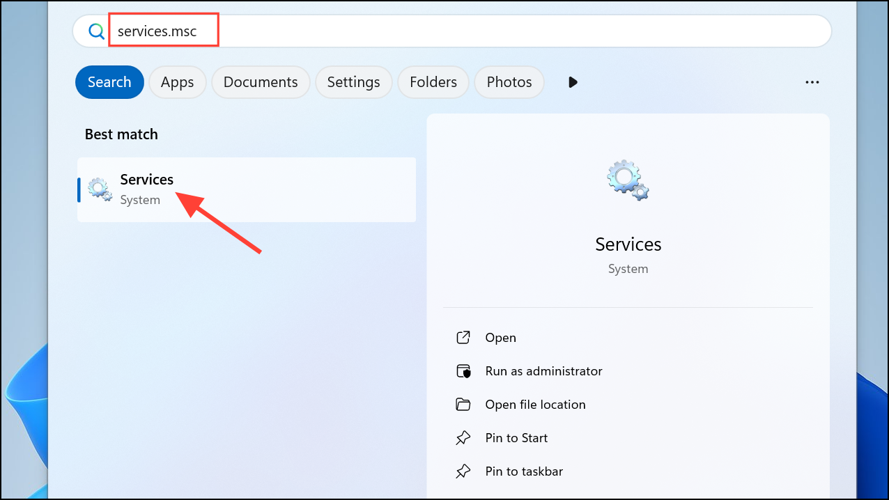 Step 1: Press Windows Key + S to open Windows Search, then type services.msc and press Enter. This launches the Services management console.