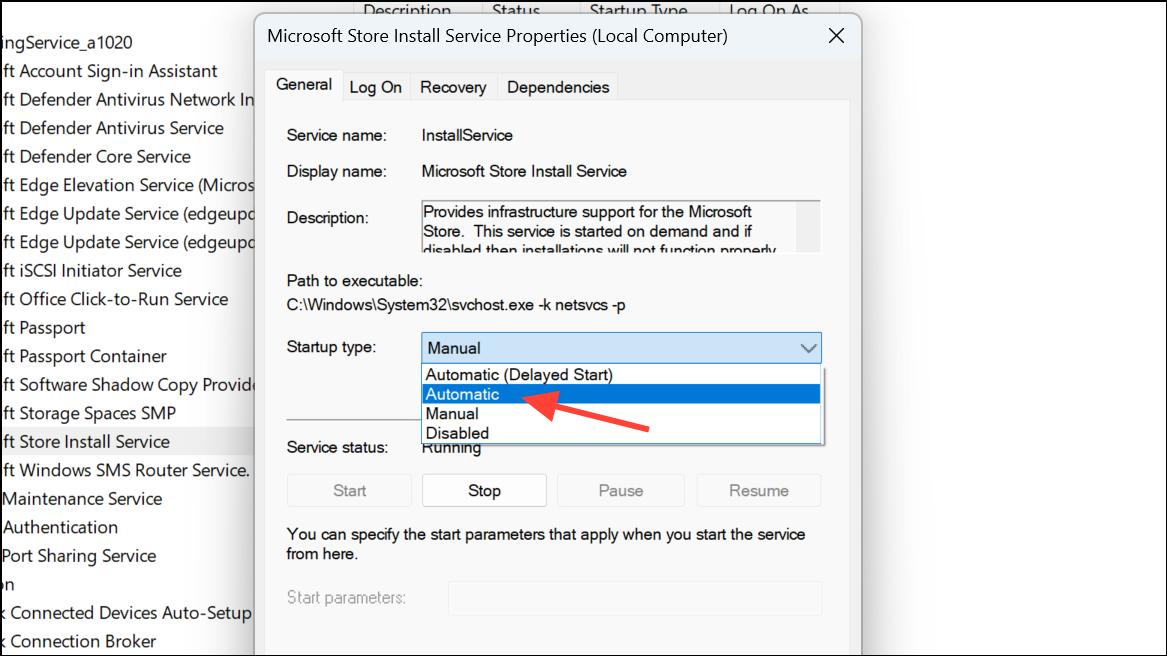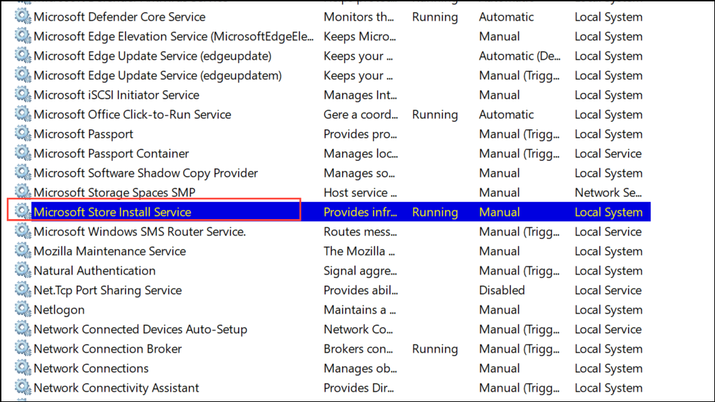 Step 2: Scroll through the list and locate Microsoft Store Install Service. Double-click to open its properties.
