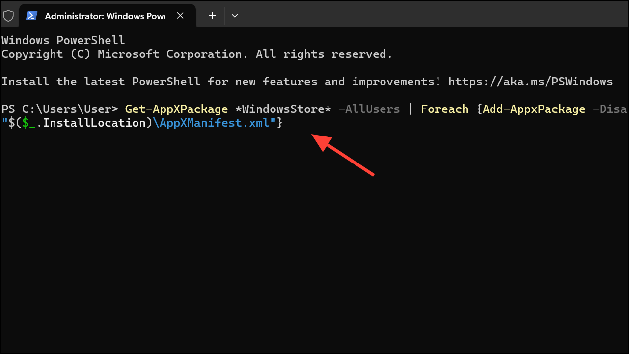 This command re-registers the Microsoft Store app for all users, repairing registration errors or missing components that block the app from launching. Restart your PC after running the command.