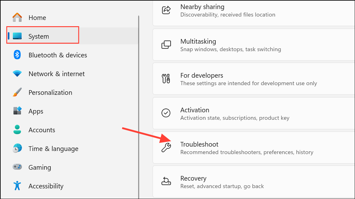 Step 1: Open Settings using the Win + I shortcut. Navigate to System and select Troubleshoot from the sidebar.