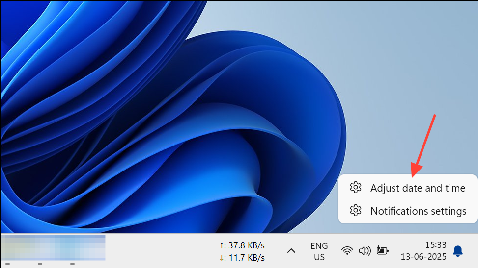 Step 1: Right-click the date and time display in the taskbar and select Adjust date and time.