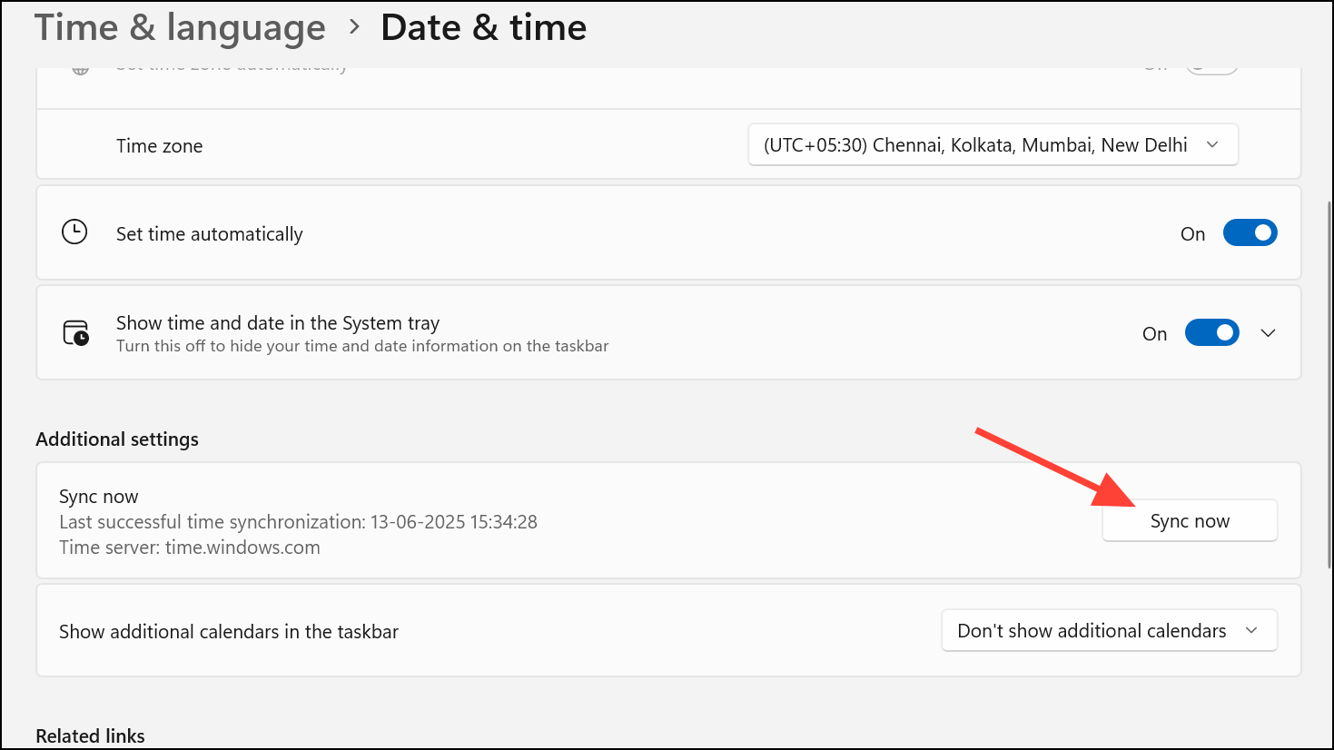 Step 3: If the time is still incorrect, manually click Sync now or adjust the date and time. Incorrect time settings can cause authentication failures with Microsoft servers, blocking Store access.