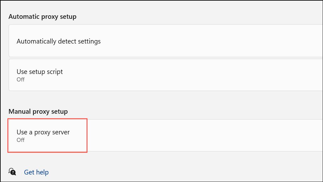 Step 2: Under Manual proxy setup, ensure Use a proxy server is turned off.