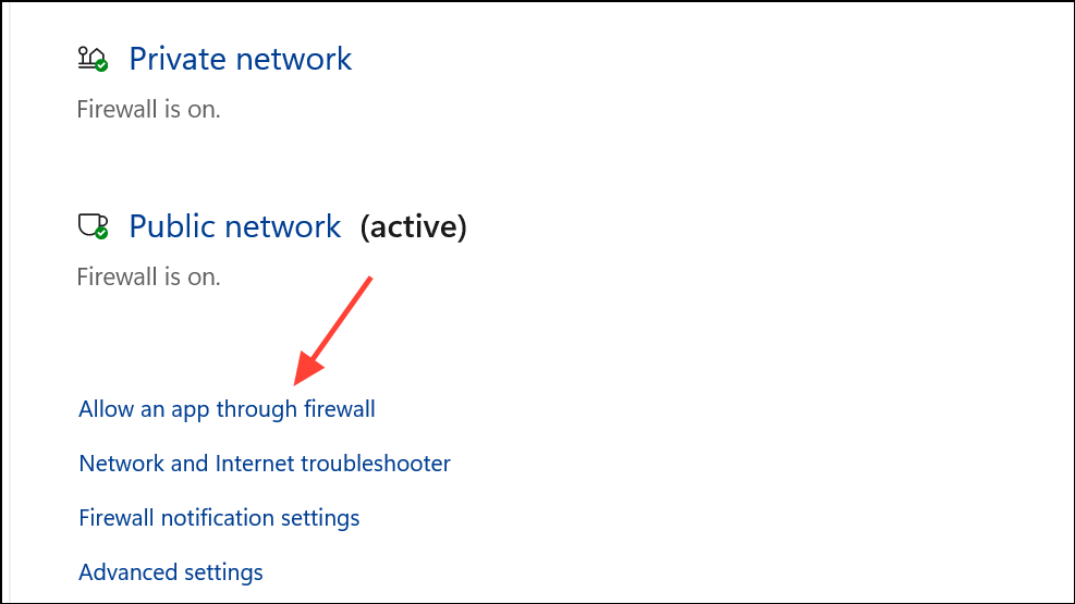 Step 2: Click Allow an app through firewall and ensure Microsoft Store is checked for both private and public networks.