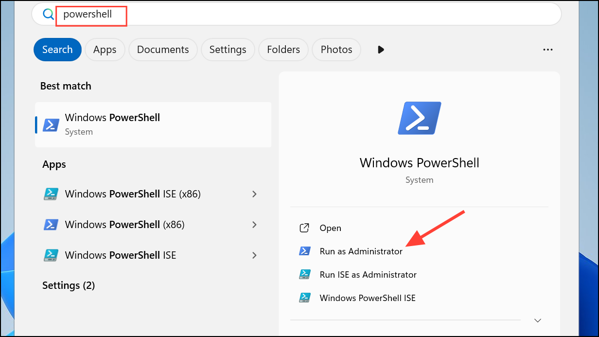Step 1: Search for PowerShell in the Start menu, right-click it, and select Run as administrator.