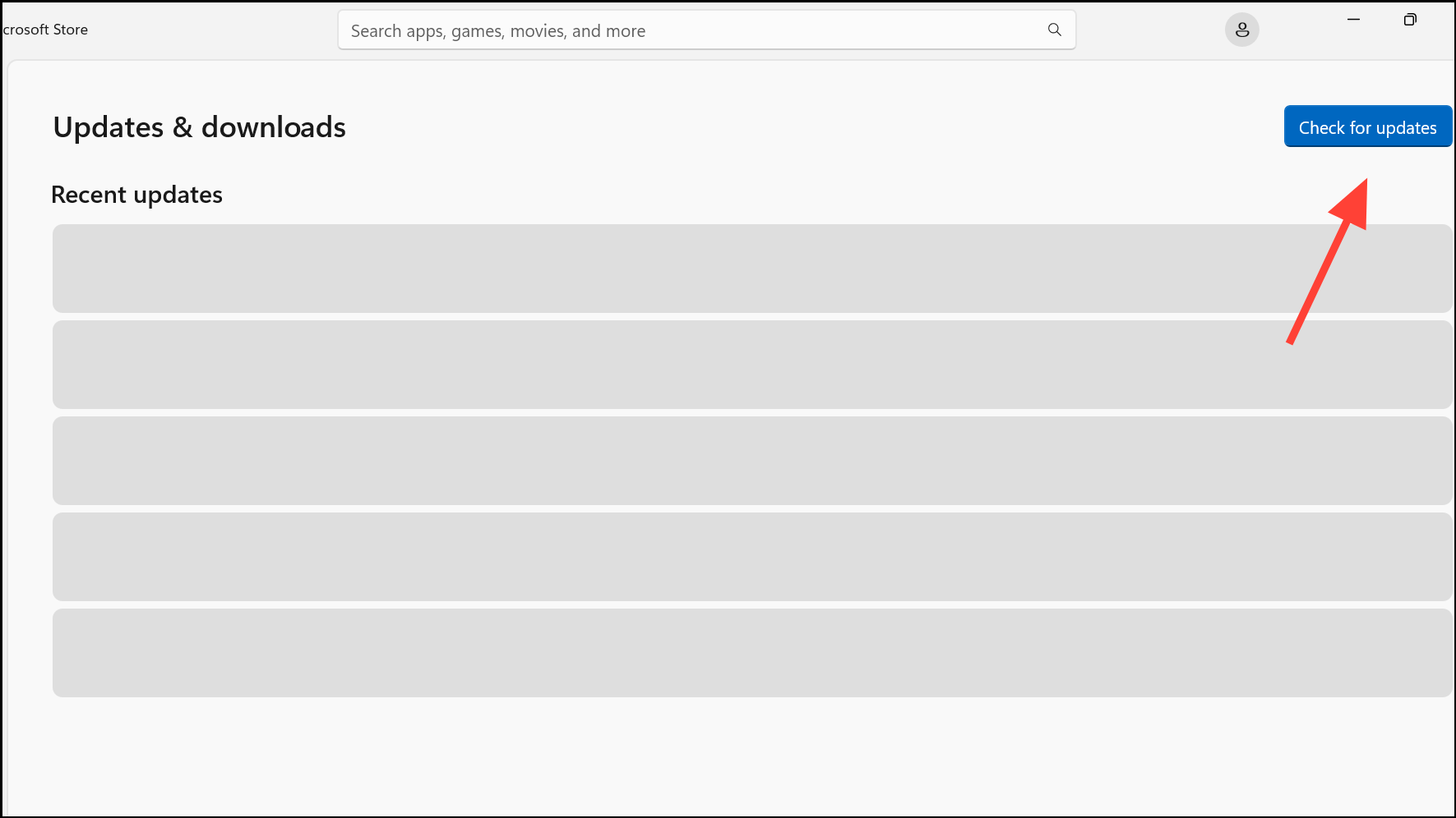 Step 1: Update the Microsoft Store to the latest version. An outdated app might not be able to complete transactions securely. Open the Microsoft Store app, select the Downloads icon in the bottom-left corner, and then click the Check for updates button at the top right. Install any available updates and restart the app.