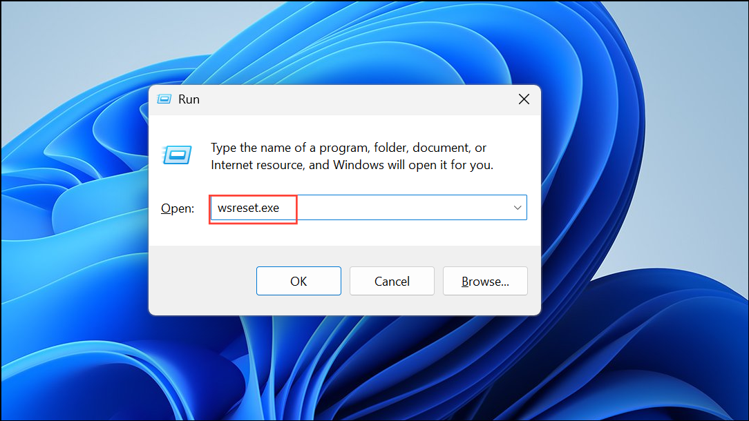 Step 2: Reset the Microsoft Store cache to clear out potentially corrupted temporary files. Press the Win + R keys to open the Run dialog box. Type wsreset.exe and press Enter. A blank Command Prompt window will appear for about ten seconds, after which it will close and the Microsoft Store will launch automatically.