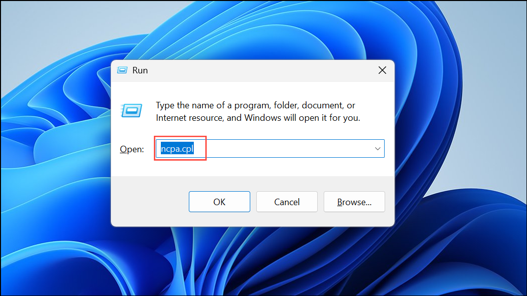 Step 2: Change your DNS server address to improve connectivity. Open the Run dialog with Win + R, type ncpa.cpl, and press Enter.