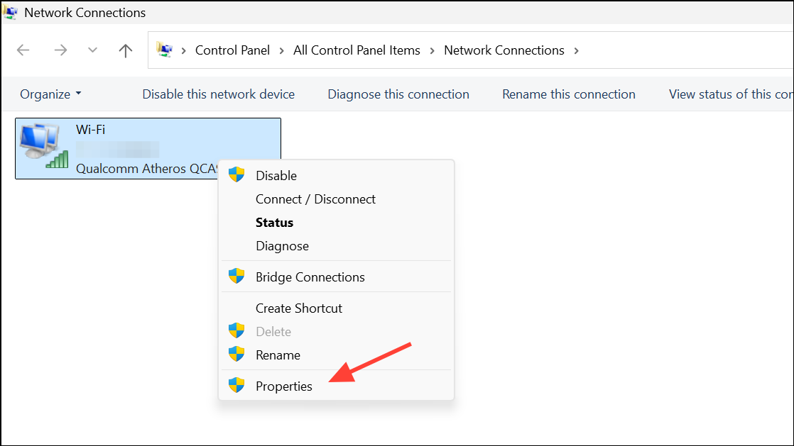 Step 3: Right-click your current network adapter (e.g., Wi-Fi or Ethernet) and select Properties.