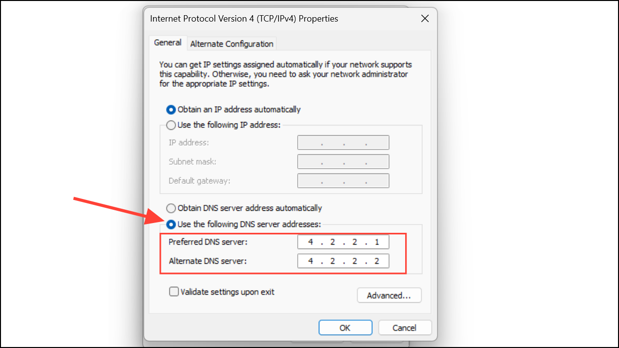 Step 5: Select Use the following DNS server addresses, and enter 4.2.2.1 as the Preferred DNS server and 4.2.2.2 as the Alternate DNS server. If this change disrupts other applications, you can revert to Obtain DNS server address automatically later.