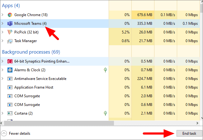 In the Task Manager, select ‘Microsoft Teams’ under Apps and click on ‘End Task’ at the bottom.