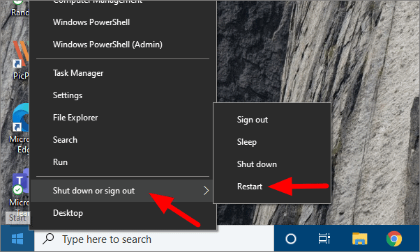 Some of the app-related issues are fixed simply by rebooting the computer. To reboot the system, right-click on the start menu, select ‘Shut down or sign out’, and then click on ‘Restart’.