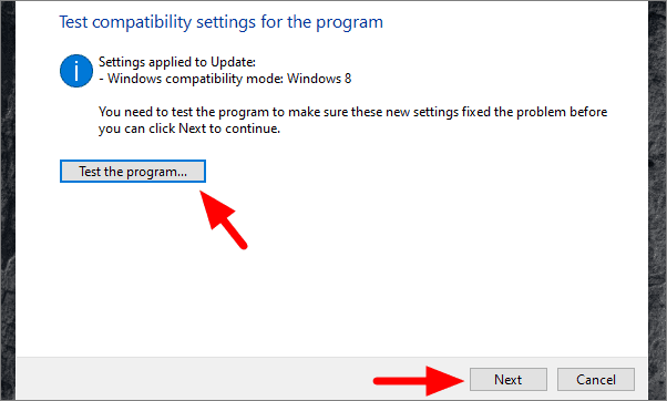 Click on ‘Test the program’ to see if the new settings fixed the issue. A window will open when you click on ‘Test the program’, which automatically closes in a couple of seconds. When the window closes, click on ‘Next’ at the bottom.