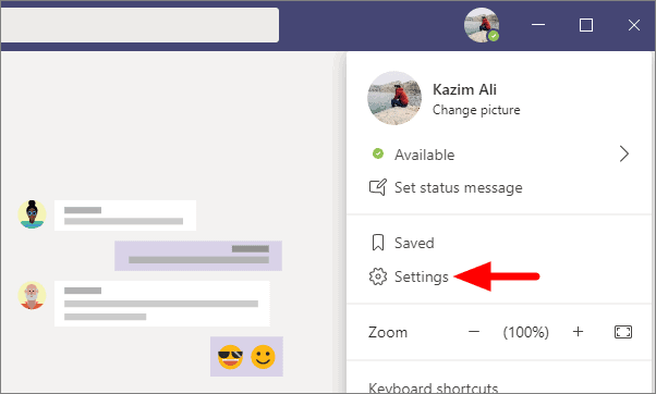 In the Microsoft Teams app, click on your picture(or initials) at the top-right corner and select ‘Settings’ from the menu.
