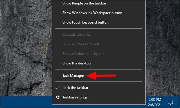 Right-click on the Taskbar and select ‘Task Manager’ from the menu.